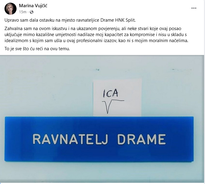 "Upravo sam dala ostavku na mjesto ravnateljice Drame HNK Split.